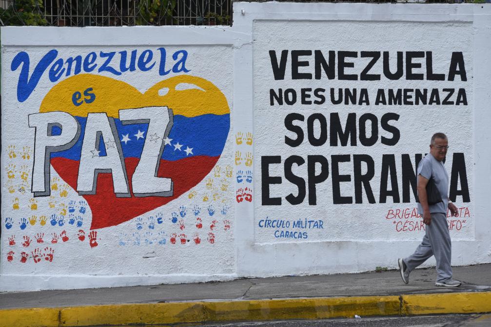 9月22日,在委内瑞拉首都加拉加斯,行人从街头的宣传标语前走过。标语上写着“委内瑞拉是和平国度”“委内瑞拉不是威胁,而是希望”。新华社发(马科斯·萨尔加多摄)