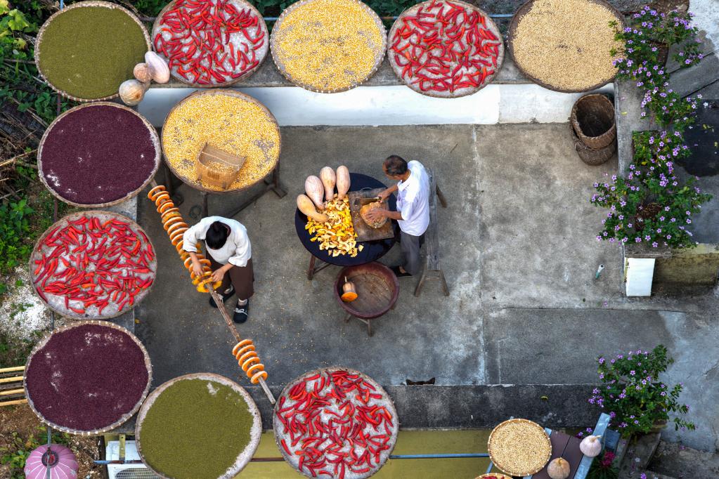 9月18日,阳产村村民在土楼前晾晒农作物(无人机照片)。新华社记者 黄博涵 摄