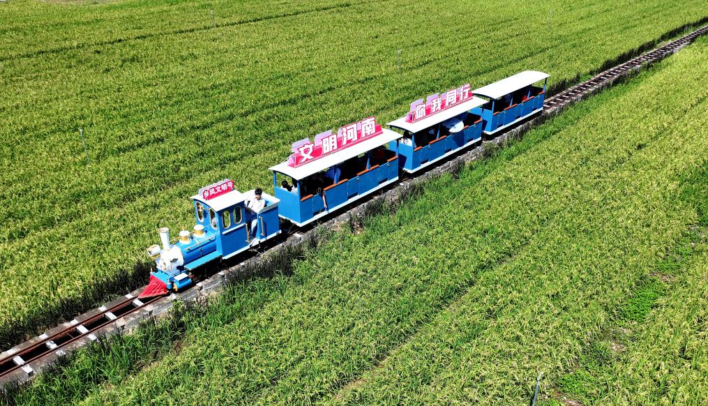2025年9月20日,观光小火车在河南省洛阳市汝阳县三屯镇东保村“稻田小镇”穿行。新华社发(康红军摄)