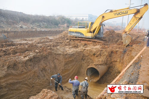 当日早上8时30分许,记者来到咸潘公路三八河段。在公路拓宽部分一侧出现5米左右的深坑,坑内一段管道被截断放置在坑外,几名工人正在坑内紧张作业,而埋在地下水管上方的公路上有一些大型机械在施工。