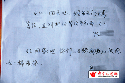 “女儿,回来吧,妈妈每天开着门等你,直到把你等回来的那一天!”“女儿回家吧,你们三个子(姊)妹都是心头肉,我一样爱你。”当着记者的面,阮女士和唐女士分别亲笔为女儿留下了一句话(如上图),她们说:“无论怎样,只要女儿愿意回家,她都不会责怪女儿。”