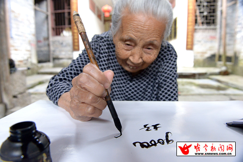 咸宁新闻网讯(记者 赵骥 张仰强)“g、o、o、d,good,好的意思。”昨日,在咸安汀泗镇大桥村,一位年过九旬的老太手持毛笔,一笔一画地在纸上写出“好”的英语单词,如果不是亲眼所见,记者很难相信这是真的。