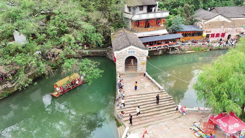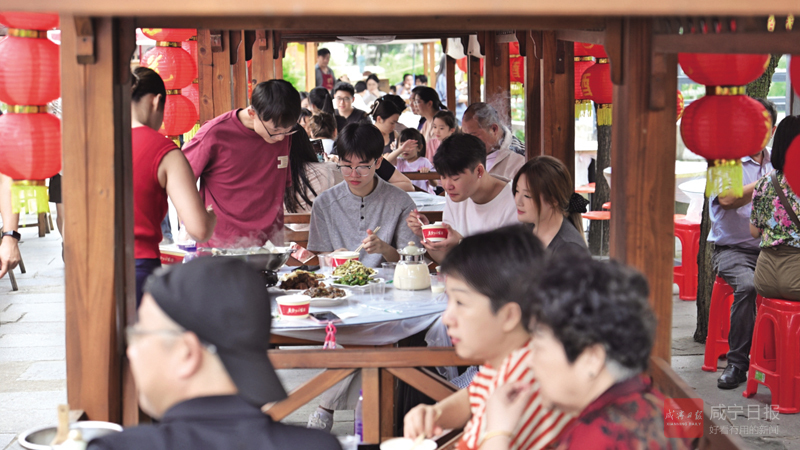 时至正午,河水旁十余家农家乐座无虚席。后厨灶火旺盛,大铁锅里翻滚着当地特色菜,农家土鸡汤、小河虾炒韭菜、井水豆腐、红薯圆子等。游客们吃了都赞不绝口。