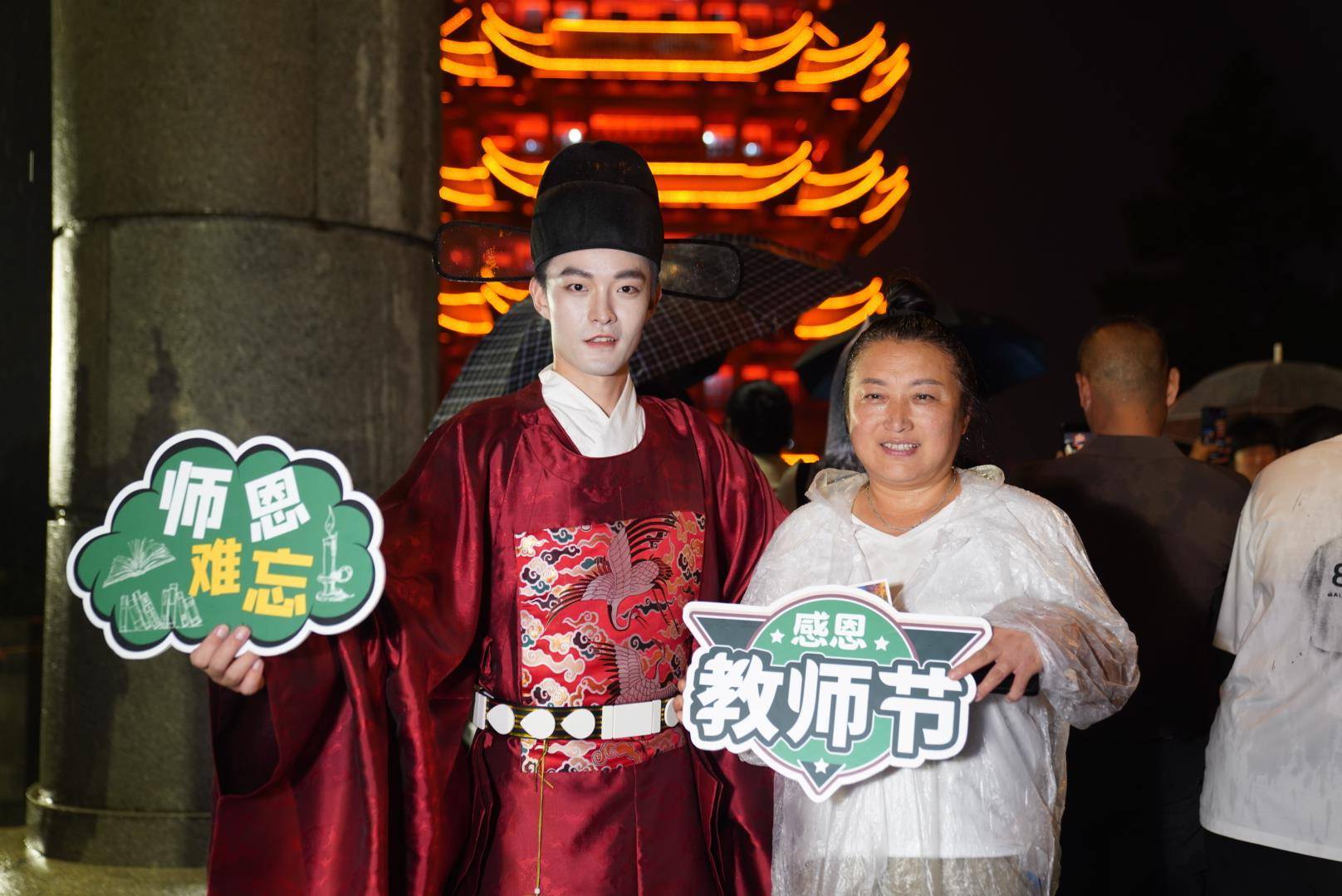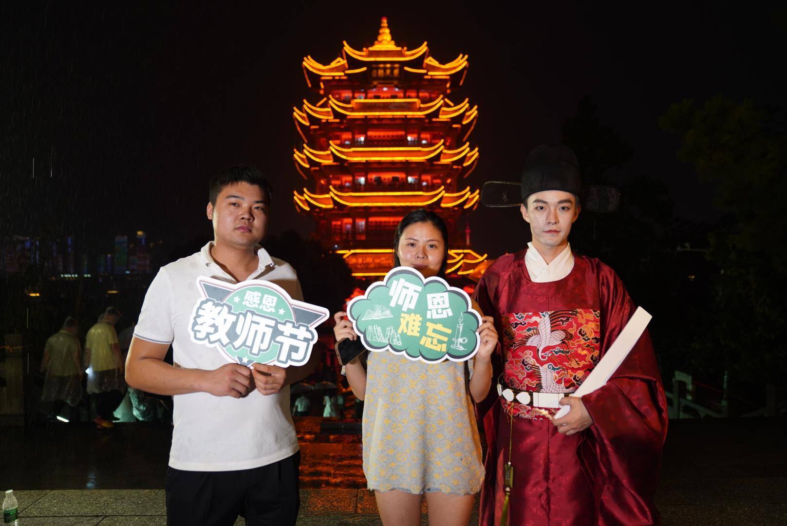 9月10日晚,恰逢教师节,《夜上黄鹤楼》推出教师专属半价游园福利,虽然当晚武汉突降一场大雨,但仍有不少游客撑伞登楼。“专属优惠很贴心,虽然雨下的很大,但是工作人员免费送上雨衣,雨中看楼也别有一番滋味。”武汉一中学老师夏女士点赞道。