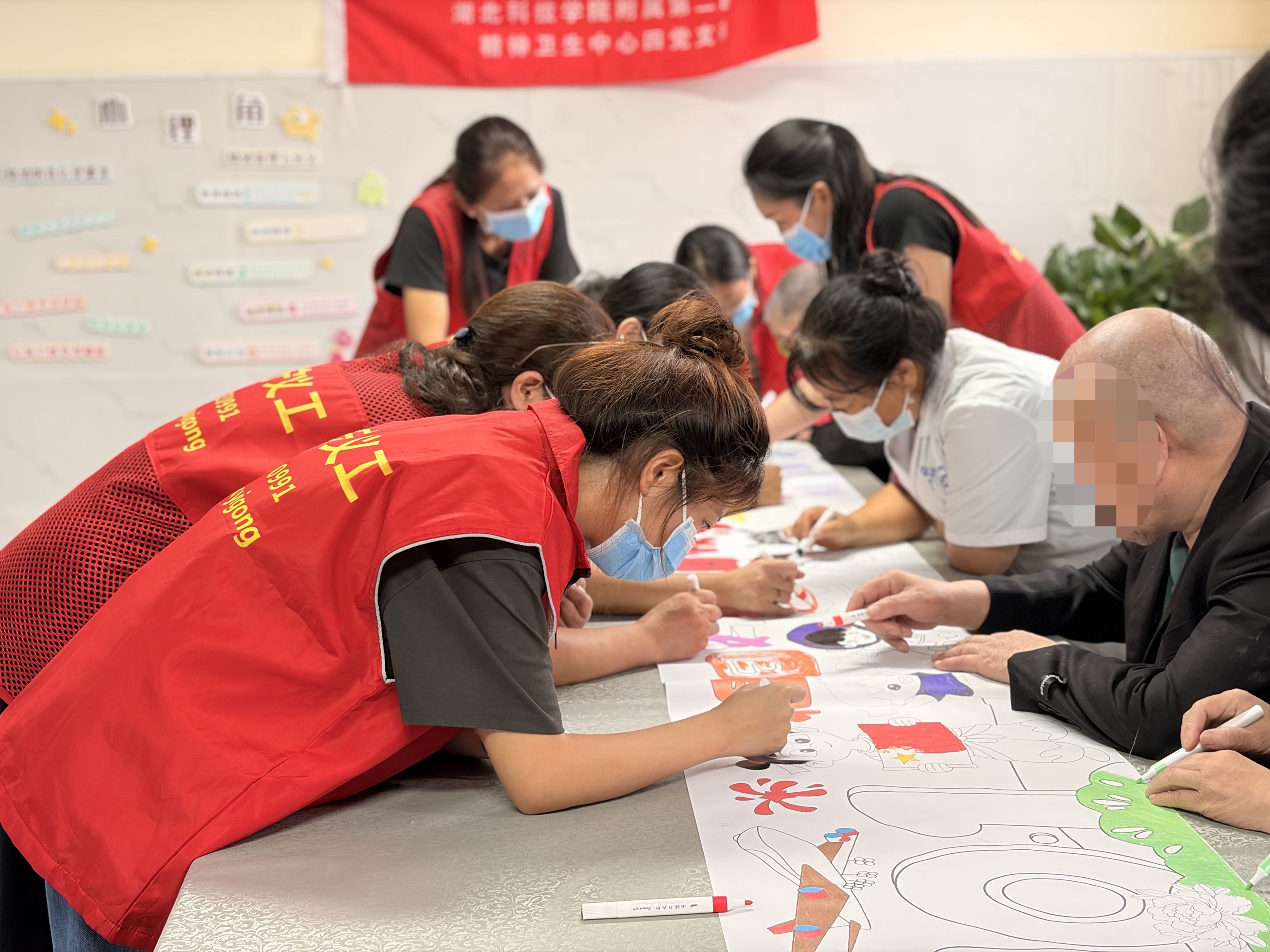 另一边的涂色角同样热闹。志愿者们和医护人员一起铺开画纸、摆好画笔后,她们鼓动老人们动手涂色,引导老人们用色彩表达对祖国的祝福。有的老人颤巍巍地握着画笔,涂抹出金黄的五角星;有的专注地勾勒天安门轮廓,虽线条简单,却满是真诚;还有的和义工们一起涂画出“祖国妈妈生日快乐”,现场充满了浓浓的爱国情怀,老人们的脸上渐渐露出了孩童般的笑容。