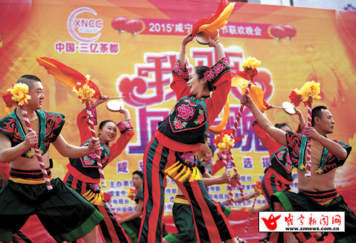 1月16日,演员们正在表演民俗歌舞“打花鞭”。当日,咸宁市“我要上春晚”大型群众节目选拔活动咸安专场在三亿茶都火热上演。