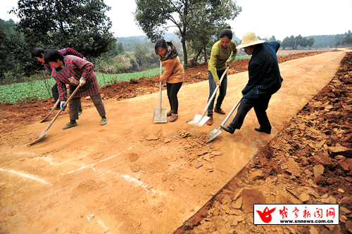 12日,咸安区汀泗桥镇黄荆塘村村民在清理村组公路,并在道路两侧栽树种草。