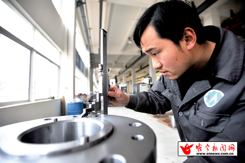 12日,赤壁市赤马港工业园赤壁明锐精密机械有限公司,一名工人正在检测产品规格是否达标。据了解,该公司于去年8月投产,主要生产精密检测设备配件、流体控制备件、起重机零部件等。目前企业以出口加工贸易为主,公司严把产品质量关,提升企业在国际市场上的竞争力,力争在3年内年销售额突破5000万元。