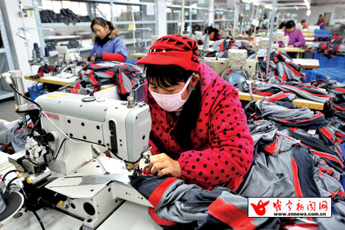 16日,赤壁市经济开发区赤壁九天制衣有限公司车间内,工人们正在赶制一批订单。