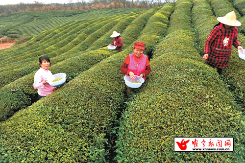 22日,崇阳县鸡鸣峰茶场开园,村民在茶园里喜采今年的第一批新茶。