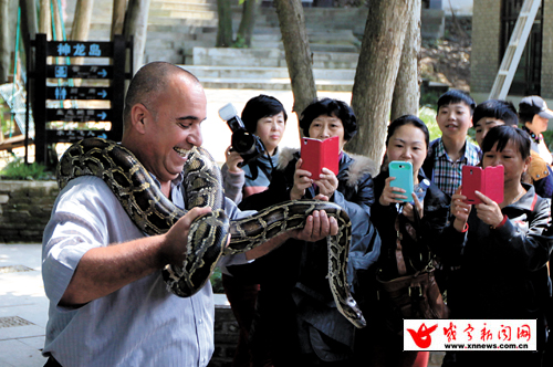 4月12日,伊拉克游客畅游陆水湖,大胆体验蟒蛇表演,更为该景区精彩的高空表演项目赞叹不已!