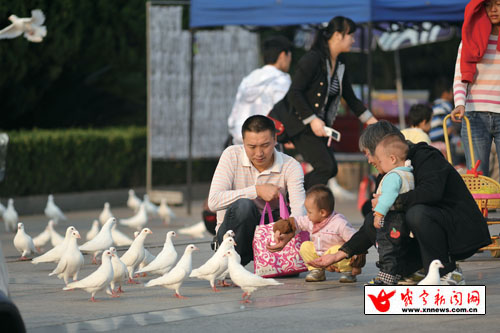 近日,记者在市人民广场上看到,随着连日气温回升,春意渐浓,不少市民带着孩子前来广场喂鸽子,享受人与动物的和谐相处。赵骥/摄