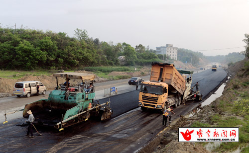 近日,记者在咸潘一级公路扩建工程咸安段浮山办事处三班口村最后一标段施工现场看到,工人正在进行沥青铺设,整条线路将全线贯通。该项目全长48.28公里,建成后将极大完善我市区域交通综合网络体系,改善市区出行环境。 赵忠志/摄