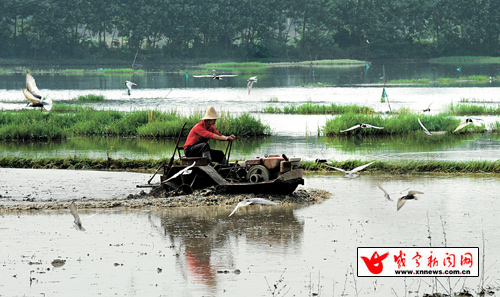 19日,赤壁市车埠镇芙蓉村村民李海兵架着犁耙船在田间犁田,引来群鸟围着他前后飞舞,好一幅人鸟合一的美丽图画。