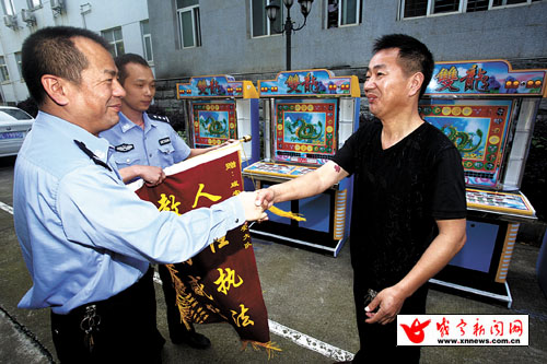 今年4月份以来,咸安区公安局开展打击查处聚众赌博专项行动。行动中,公安民警多次上门,向经营游戏机厅的残疾人盛某、谢某和王某讲解赌博机的社会危害性。经过多次教育感化,盛某和同伴王某主动将赌博机送交公安机关,并赠送“人性执法”的锦旗。