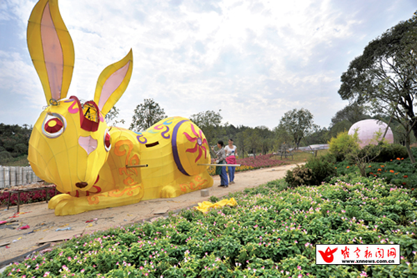 17日,香泉映月生态旅游度假区桂博园,一座玉兔彩灯快装扎完毕。