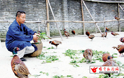 20日,通城县马港镇界上村绿源家庭农场,村民陈岳飞正在喂养山鸡。为充分利用资源,带动周边村民致富,该农场以“公司+农户”的方式,积极发展立体种养模式。目前,该农场年出栏山鸡2万余只,土鸡、番鸭12万余只,产值近200万元。