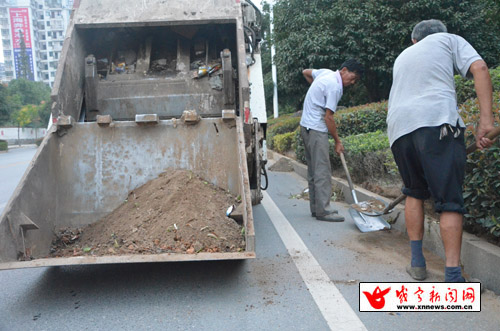 9月17日,在第七届国际温泉文化旅游节即将来临之际,市环卫局永安环卫处组织160余人,对市区银泉大道与金桂路交叉处至桂乡大道107国道互通的道路与花坛交接处泥土进行集中清理、清运。(记者周阳 通讯员刘红)