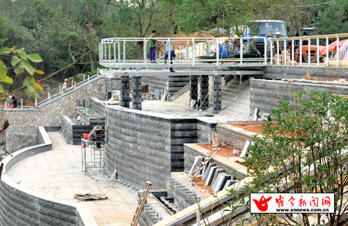 18日,园博会咸宁园百泉伴月景点,工人正在加紧收尾工作。百泉伴月是咸宁园的一个重要景点,根据园区活动主题,将有萨克斯、大提琴、钢琴等不同的音乐演奏。景点利用地形、地势,结合水流、水帘等水景构造手法,将桂、月、泉组成一个经典的画面。记者 陈红菊 摄