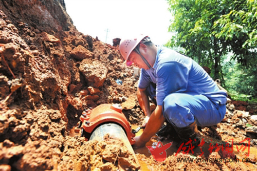 8日,咸安区向阳湖镇,联合水务公司工作人员正抓紧抢修供水管。7日晚11点半,咸潘公路甘棠段因洪水出现50多米的滑坡,路面塌陷,供水主管被损近20米,造成咸安城区停水,温泉城区水压低下。联合水务正全力抢修,预计9日中午12时前修通供水。