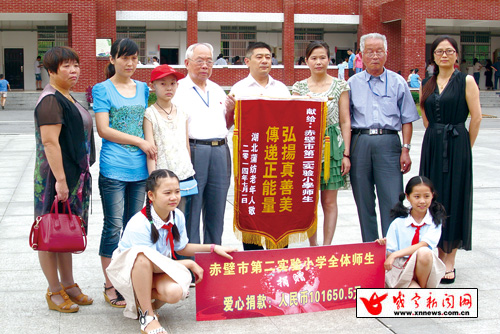 今年6月份,赤壁市第二小学获悉后,向全校师生发起的《爱心公益活动倡议书》,号召师生用实际行动帮助3名学子战胜病魔。倡议发出后,该校师生迅速行动起来,纷纷伸出援助之手,不少学生捐出了自己的零花钱和压岁钱。一位不愿透露姓名的学生家长还捐出了3300元。据悉,该校全体师生一共捐款101650.5元。