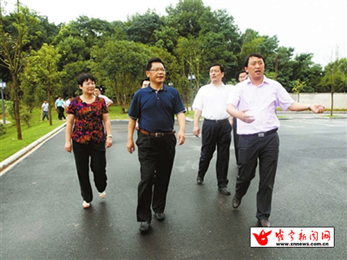 市委书记任振鹤(左二)、市长丁小强(右二)率市拉练检查团检查崇阳大集公园。
