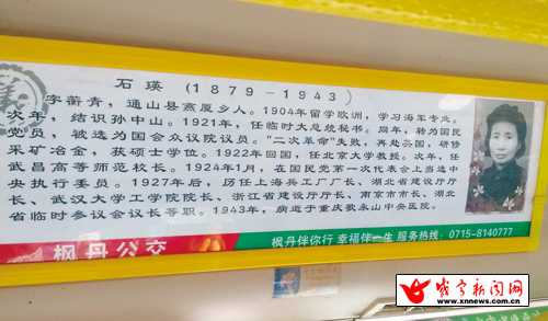 咸宁新闻网讯 (记者 方达星)公交车是城市的窗口,公交车厢内张贴咸宁历史人物,可以更好地向游客及市民展示我市文化底蕴。但近日市民向香城都市报反映,在城区1路公交车内,出现了历史人物简介照片张冠李戴的现象,石瑛的简介上附带着钱瑛的照片。
