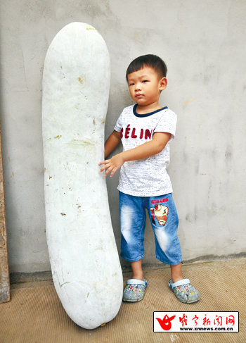 记者看到,冬瓜竖起来后,比樊大妈的孙子(3岁半)还高,重量是孙子的3倍。“活了大半辈子,还是第一次见这么大的冬瓜!”围观的村民说。