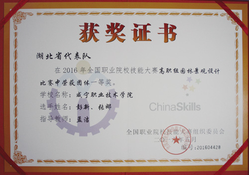 5月15日,2016年全国职业院校技能大赛园林景观设计项目比赛在江苏农林职业技术学院落下帷幕。在此次比赛中,由咸宁职业技术学院生物工程学院园林专业大三学生彭新、张娜两位同学组成的“园林景观设计”代表队,在强手如林的“国赛”中不负众望,经过激烈角逐,最终以扎实的理论功底、娴熟的技能操作和良好的心理素质取得该赛项一等奖,孟洁老师获得“全国优秀指导教师”荣誉称号。