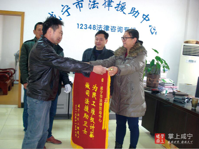 咸宁新闻网讯(香城都市报记者吴青朋 通讯员陈静梅) “非常感谢,多亏你们法援律师的帮忙,我们的工资才能顺利要回来。”11月28日,在市法律援助中心,刘道炎、徐广洲、全广明三位农民工代表将一面书写着“为民工维权讨薪,做司法援助卫士”的鲜红锦旗送到法律援助律师手中。