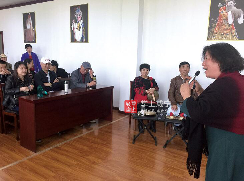 咸宁市京剧社社长彭雄早向客人介绍了京剧社发展的情况。咸宁市京剧社自2011年成立以来,在市委、市政府以及省文化厅的关怀下,在市民政局、文新广局、市老龄办、市老干局、市财政局的大力支持下,不断发展,现有会员100余人。自成立至今,已开展各种活动126场次:同全国十八个大中城市及海外(美国、加拿大)京剧票房开展联谊活动79次;送戏到农村、到福利院、到校园16次;为企业、扶贫点、乡镇、社区和驻咸部队义务演出31次,受到广大戏迷朋友的热烈欢迎,为咸宁的京剧艺术和群众文化普及,为我市的旅游及和谐社会发展作出了积极贡献。