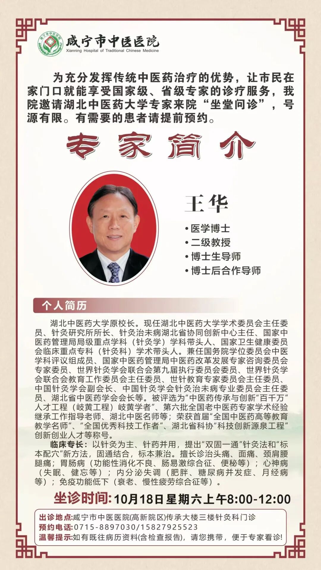 10月18日(周六)上午,现任湖北中医药大学学术委员会主任委员、针灸研究所所长、针灸治未病湖北省协同创新中心主任、国家中医药管理局局级重点学科(针灸学)学科带头人王华教授到我院坐诊。