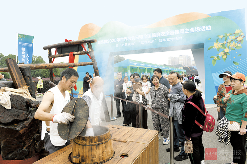 品鉴区更是排起“试吃”长龙。刚出锅的“江汉大米”饭香扑鼻,用大米制作的桂花糕、米酒、鱼头泡饭等食品琳琅满目;用湖北菜籽油现场煎炸的鸡蛋、豆腐、面窝香气四溢。米香与油香交织,现场“粮”味十足。