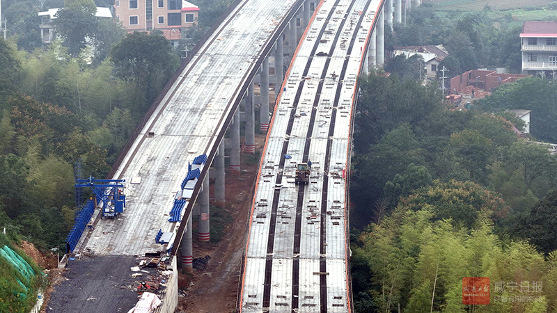 9月24日,咸宁城区南外环高速公路(咸宁桂花至汀泗高速公路)项目的桥梁、路基工程已开工,李家湾隧道初现雏形。