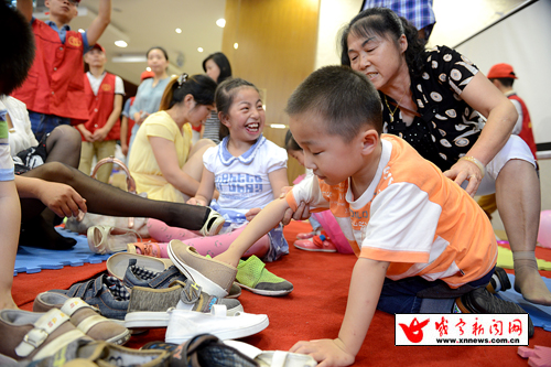 活动伊始,现场许多儿童和家长便跃跃欲试,等待参加游戏。“孩子,你真棒!”在“我帮爸妈穿鞋子”的游戏中,尽管参加游戏的自闭症儿童没有正常同龄儿童那样迅速敏捷,但在他们几次努力下,孩子们在一堆鞋子里找出爸妈的鞋并穿好,家长为孩子的成功竖起大拇指,并击掌祝贺。