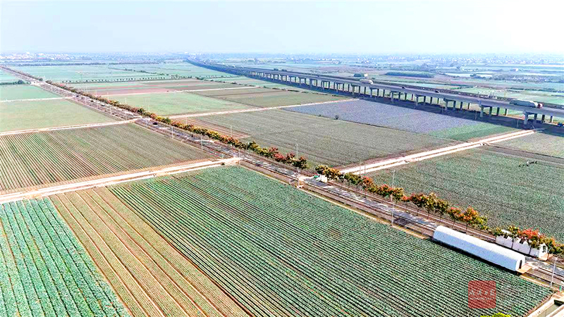 距此17公里外的十里蔬菜长廊一望无垠,一排排、一列列刚从大棚移植过来的甘蓝苗生机勃勃,满目翠绿。