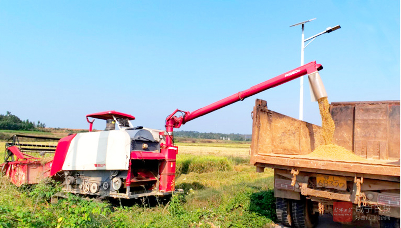 10月14日,在赤壁黄盖湖镇黄盖咀村的百亩稻田里,2台收割机开足马力穿梭作业,不一会儿,沉甸甸的稻穗便脱粒成金灿灿的稻谷,被源源不断地输送到一旁等候的运输车上。种粮大户宋东海在此承包粮田已有8年,今年他种植的是“昌两优135”水稻品种,看着满车即将运走的稻谷,脸上洋溢着丰收的喜悦。