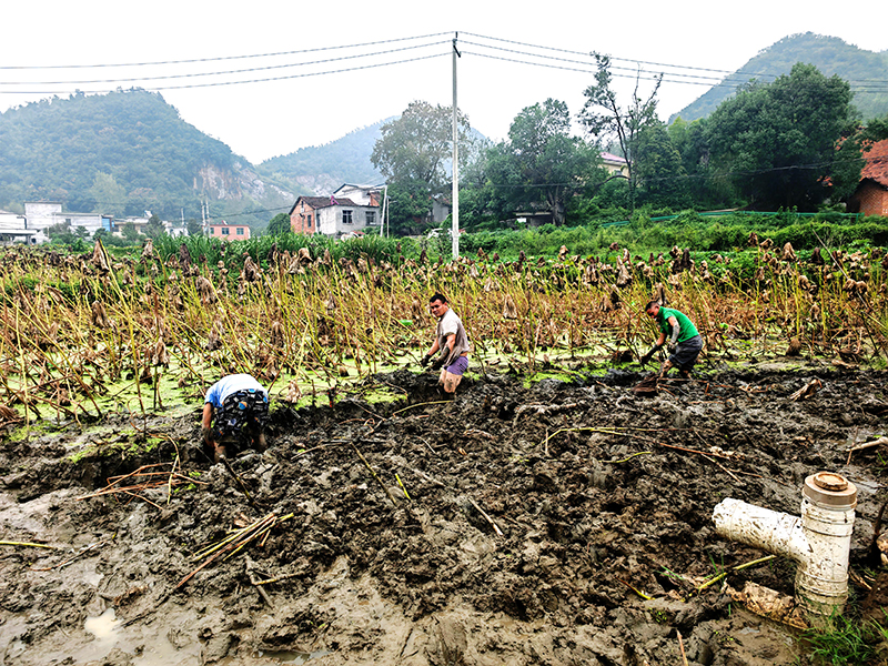 在基地里,59岁的刘大爷正忙着徒手挖藕。只见他小心翼翼地探入泥中,顺着藕尖慢慢往前摸。“挖藕可得有耐心,20分钟才能挖出一根完整的藕。”刘大爷一边说着,一边展示着自己的成果。他告诉笔者,自己每天早上5点就来到藕田,和另外4名村民一起劳作,一天下来能挖200斤左右。虽然今年的藕因为塘泥情况,挖起来比往年稍费力,但刘大爷笑着说:“多种几年,泥塘更适应了,后面就好挖了。”
